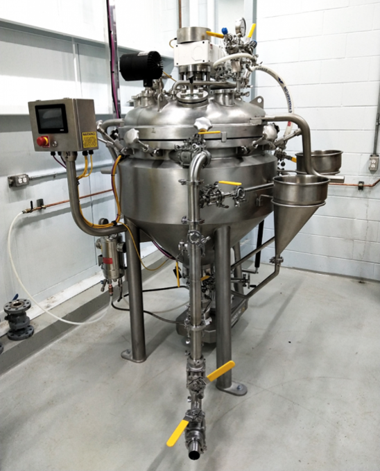 Cuve de 250 L munis de moteurs électriques antidéflagrants permettant l’agitation, la dispersion et la recirculation de la matière. L’équipement est muni de système d’injection de liquide et de solide directement au niveau du rotor-stator de la zone de dispersion. L’équipement possède également une double enveloppe permettant de réchauffer ou refroidir le mélange.